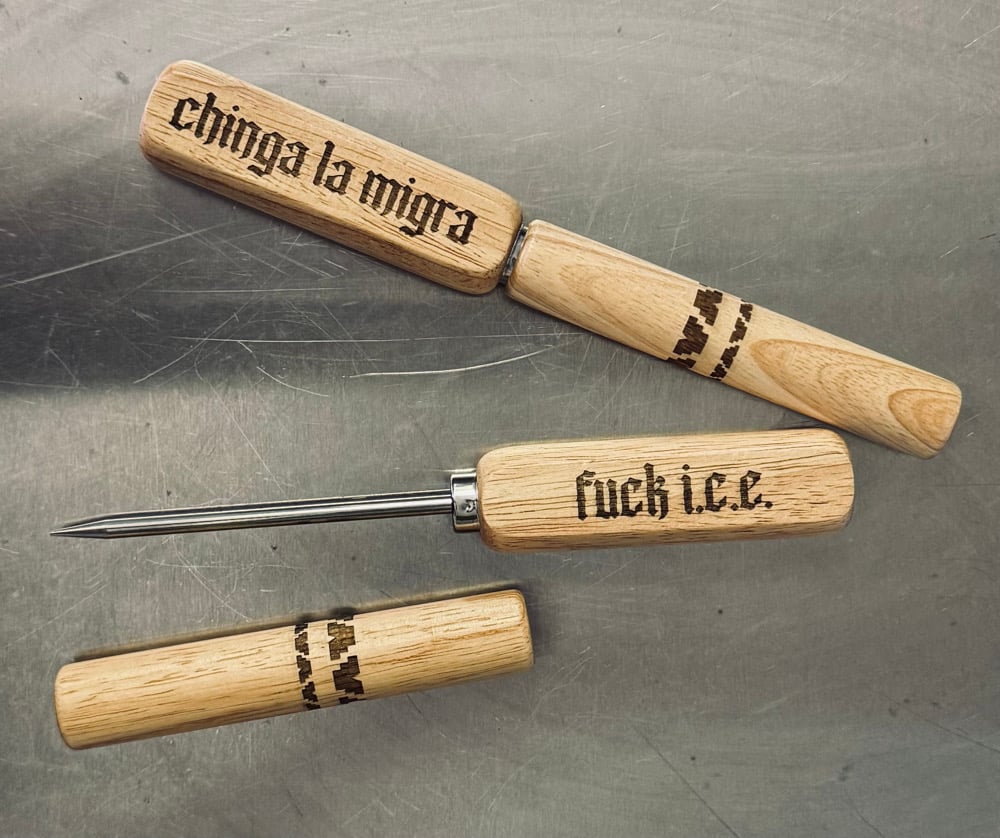 “Fuck ICE” on one side, “Chinga La Migra” on the other.